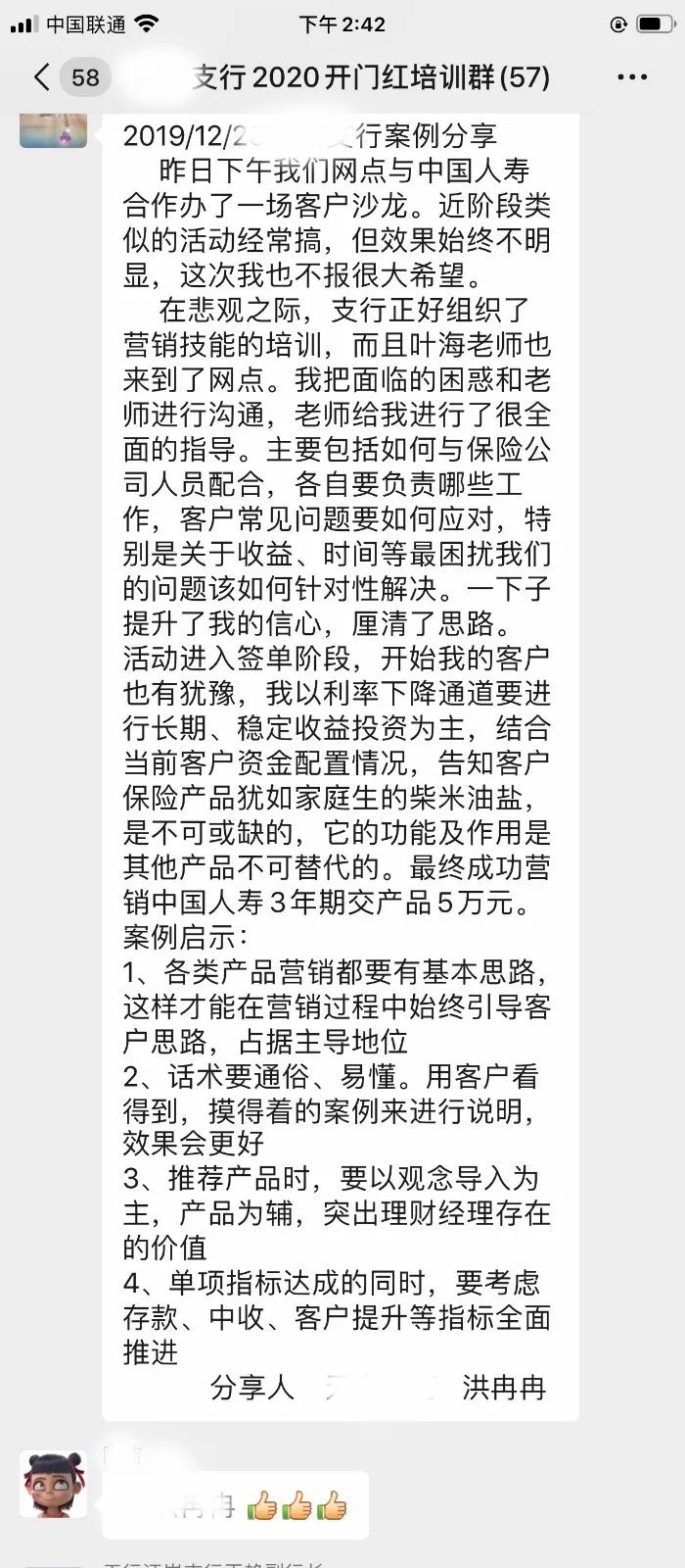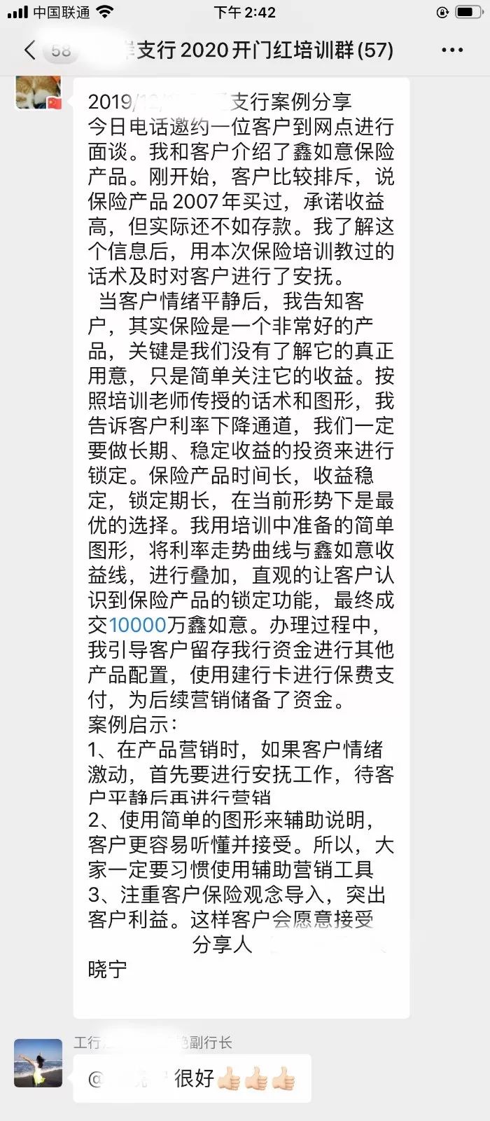 老师利用晨会、夕会的时间对产品营销场景进行模拟,应用老师教导的话术及思路,通过对不同产品营销话术的学习,能更好的了解客户购买产品的心态,理清营销产品的思路,有效提高营销技能,从而提高营销业绩。 ![]() 分享 ![]() ![]() ![]() ![]() ![]() ![]() ![]() ![]() ![]() ![]() ![]() 精彩授课 ![]() ![]() ![]() ![]() 小结 ![]() 王行长在晚课上讲到通过此次培训改善了网点人员营销的状态,老师在培训过程中传授了很多干活知识,也提升了大家的信心,同时通过不同场景话术学习,也很好的提升了大家的营销技能,希望大家在培训后的工作中,积极应用今日所学,继续保持状态,固化提升培训效果。 ![]() ![]() ![]() ![]() ![]() |